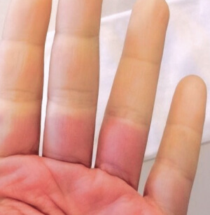 В большинстве случаев болезнь Рейно проявляться на средних трех пальцах, и в виде четкого изменения цвета с переходами. Синдром Рейно в первичном случае может иметь длительность от минут до часов. При склеродермии - заболевании соединительной ткани, сопровождающееся уплотнением и утолщением кожи с потерей эластичности и подвижности и нарушением кровоснабжения, возможны появления язв. А при вторичном синдроме Рейно может прогрессировать до гангрены.